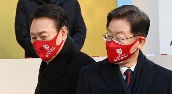 ▲ 더불어민주당 이재명(오른쪽), 국민의힘 윤석열 대선 후보가 지난 3일 서울 여의도 한국거래소에서 열린 2022 증시대동제에 참석해 행사장으로 이동하고 있다. [뉴시스]