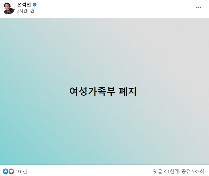 윤 후보는 지난해 10월 여가부를 '양성평등가족부'로 개편하고 관련 업무와 예산을 재조정하겠다는 공약을 내놓은 바 있다. 그런데 이번 페북 글은 '여가부 개편'에서 '여가부 폐지'로 입장을 바꾼 것으로 받아들여진다. 단기간에 2030 지지율을 회복하기 위해 '초강수'를 두는 것 아니냐는 분석이 나온다. 여성 반발 등 역풍이 만만치 않을 것이라는 우려가 나온다.