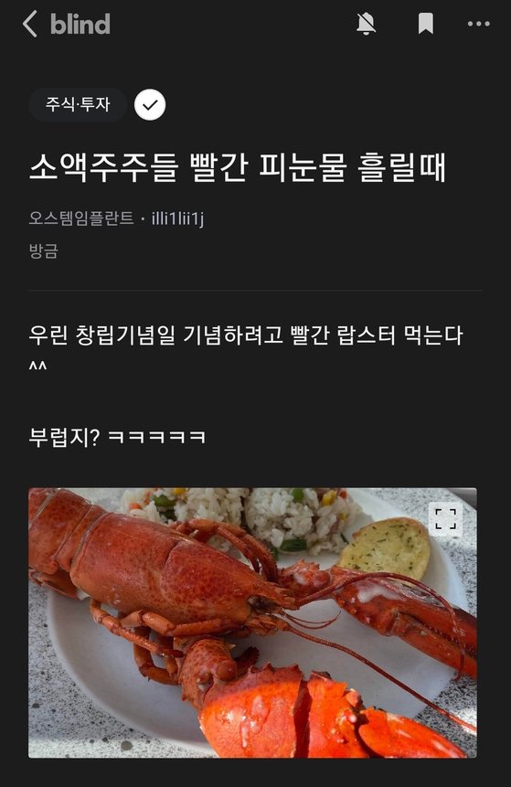 오스템임플란트 창립기념일(1월 8일) 전날 글 올렸다 삭제 1980억 원 규모의 역대급 횡령 사건이 벌어진 오스템임플란트의 직원으로 추정되는 인물이 인터넷 커뮤니티에 조롱의 글을 올려 논란 중이다. 글쓴이는 7일 직장인 익명 커뮤니티 '블라인드'의 주식·투자란에 "소액주주들 피눈물 흘릴 때 우린 창립 기념일이라 빨간 랍스터를 먹는다"는 글을 올리며 랍스터 사진을 함께 게재했다.