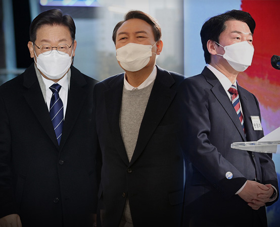 양자 대결에선 상황이 달라진다. 이 후보, 윤 후보는 44.5%, 39.2%였다. 이 후보, 안 후보는 38.2%, 43.5%였다. 각각 대결에서 두 후보 격차는 모두 5.3%p로 오차범위 안이다. 엄밀히 말하면 둘 다 접전인 셈이다. 그럼에도 안 후보는 이런 여론조사 결과를 자신이 이 후보를 꺾을 승산이 더 높음을 부각하는 근거로 활용할 수 있을 법하다.