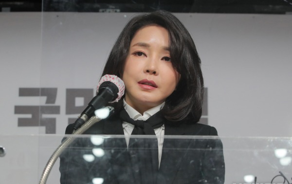 ▲ 국민의힘 윤석열 대선 후보 부인 김건희 코바나컨텐츠 대표가 지난해 12월 26일 서울 여의도 중앙당사에서 허위 이력 의혹과 관련해 입장문을 발표하고 있다. [뉴시스]
