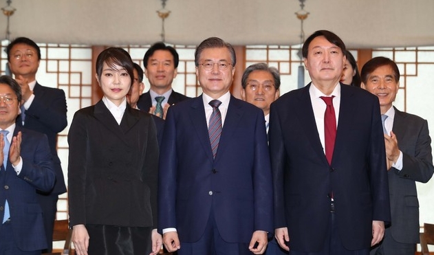 ▲ 문재인 대통령이 지난 2019년 7월 25일 청와대 본관에서 신임 검찰총장에 임명된 국민의힘 윤석열 대선 후보와 임명장 수여식 후 기념촬영을 하고 있다. 당시 윤 후보 부인 김건희 씨도 함께했다. [뉴시스]