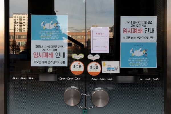 ▲ 지난 6일 코로나19 '오미크론' 변이 바이러스 확진자가 발생한 인천의 한 교회 입구 [문재원 기자]