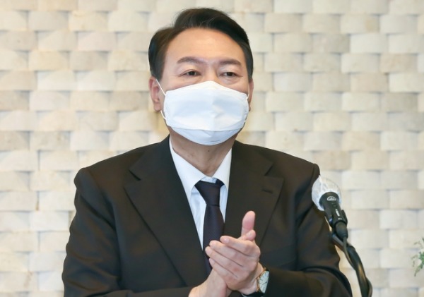▲ 윤석열 국민의힘 대선 후보가 지난 16일 오후 서울시 마포구 케이터틀에서 열린 서울 국회의원 및 당협위원장 연석회의에 참석해 박수를 치고 있다. [뉴시스]