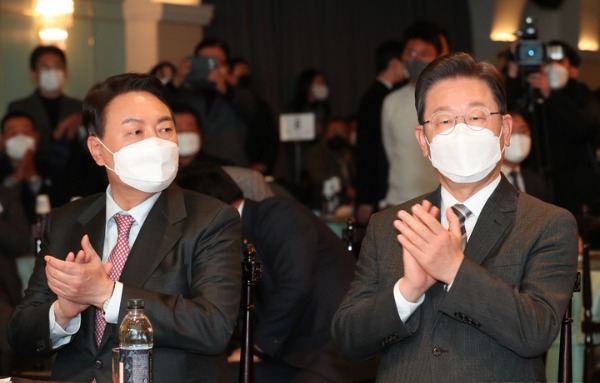 ▲ 더불어민주당 이재명(오른쪽), 국민의힘 윤석열 대선 후보가 18일 오후 서울 여의도 한 빌딩에서 열린 소상공인연합회 신년인사회에 나란히 참석해 손뼉을 치고 있다. [뉴시스]