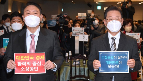 ▲ 더불어민주당 이재명(오른쪽), 국민의힘 윤석열 대선후보가 18일 서울 여의도 CCMM빌딩에서 열린 2022년 소상공인연합회 신년인사회에 참석해 팻말을 들고 있다. [뉴시스]