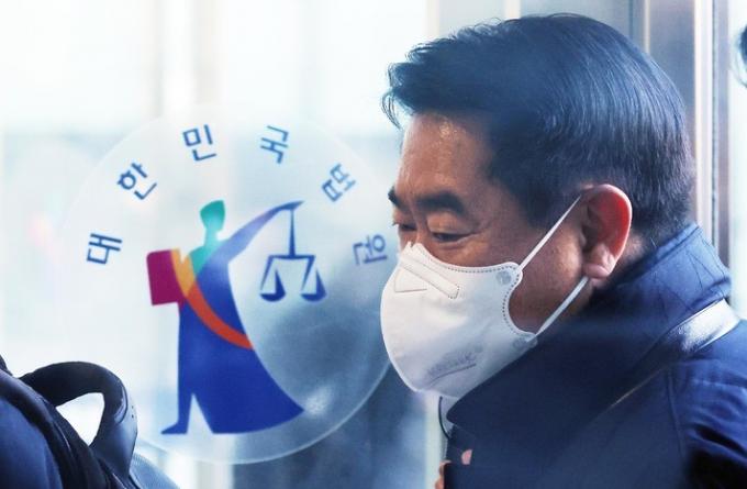 ▲뇌물수수 혐의 등으로 구속영장이 청구된 최윤길 전 성남시의회 의장이 18일 오전 경기도 수원지방법원에서 열린 구속 전 피의자 심문에 출석하고 있다.[뉴시스]