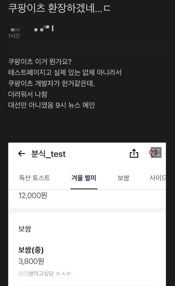 19일 직장인 익명 커뮤니티 앱 '블라인드'에는 "쿠팡이츠 환장하겠네…"라는 제목의 게시글이 올라왔다. 글 작성자는 "테스트페이지고 실제 있는 업체가 아니라서 쿠팡이츠 개발자가 한거 같다"며 "더러워서 나참. 대선만 아니면 9시뉴스 메인"이라고 썼다.
