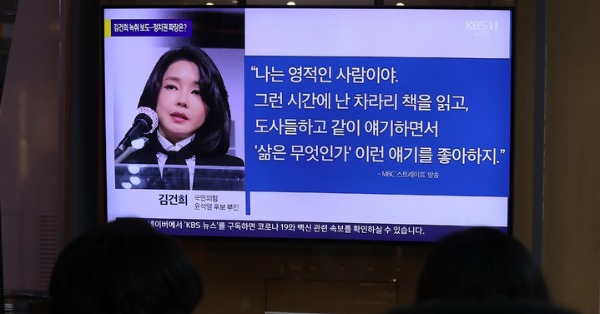 ▲ 지난 17일 오후 서울역 대합실에서 시민들이 국민의힘 윤석열 대선 후보 배우자 김건희 씨의 '7시간 통화' 보도 관련 뉴스를 보고 있다. [뉴시스]