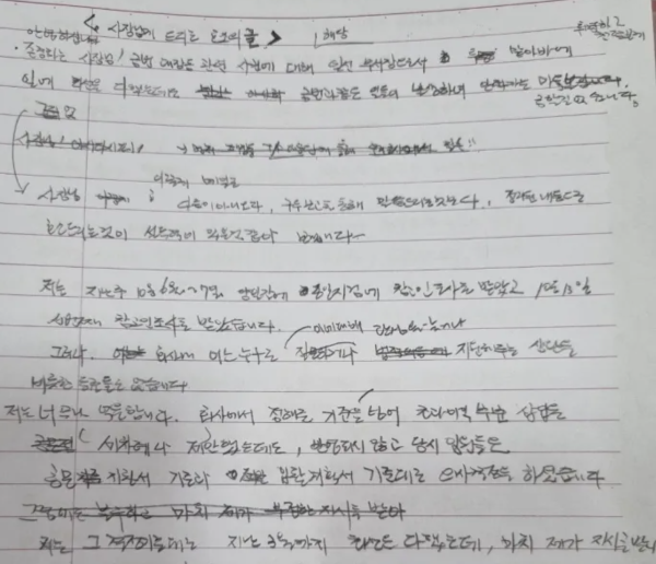 김 처장의 동생 A 씨는 19일 김 처장이 생전에 자필로 쓴 '사장님께 드리는 호소의 글'이라는 제목의 2페이지 분량 편지를 공개했다. 이는 김 처장이 지난달 21일 숨지기 전 남긴 글인 것으로 알려졌다.