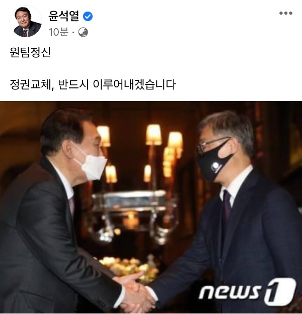 윤 후보는 최 전 원장과 헤어진 직후 페이스북에 만남 사진을 첨부하며 "원팀정신"이라고 적었다. "정권교체, 반드시 이뤄내겠다"면서다.