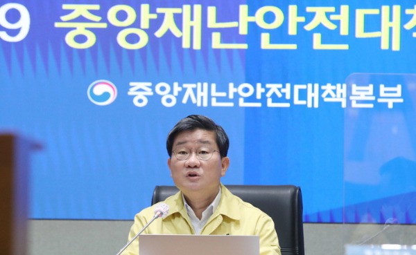 ▲ 24일 전해철 중앙재난안전대책본부(중대본) 2차장(행정안전부 장관)이 서울 종로구 정부서울청사에서 열린 코로나19 중대본 회의에 참석해 발언하고 있다. [뉴시스]