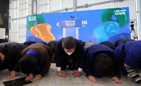 이 후보는 이날 경기 용인 포은아트홀에서 "경기도를 누구보다도 잘 아는 이재명이 경기도의 대전환 반드시 이루겠다"며 경기 지역 공약을 발표했다. 그는 발표에 앞서 "민주당이 앞으로 더 잘할 뿐만 아니라 우리가 많이 부족했다는 사과의 말씀을 겸해 인사를 드릴까 한다"며 동행한 경기 지역구 의원들과 함께 큰절을 했다.