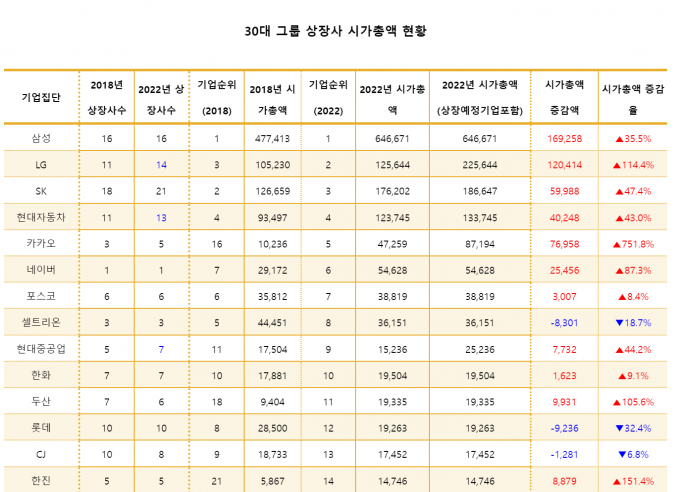 2018년 1월 2일 당시 30대 그룹 상장사 185개의 시가총액은 1129조4040억 원이었다. 이와 비교하면 시가총액이 4년 새 494조6440억 원(43.8%) 증가하는 셈이다.