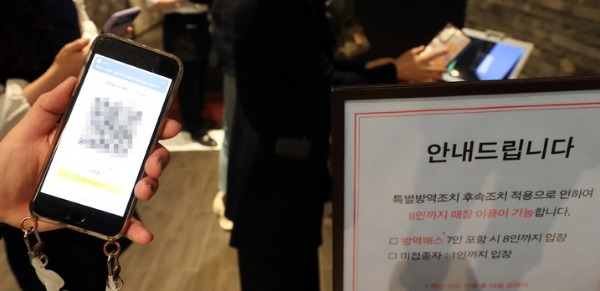 ▲지난 13일 부산 해운대구의 한 음식점 입구에서 손님들이 코로나19 백신 접종 완료 확인을 위해 QR코드 인증을 하고 있다. [뉴시스]