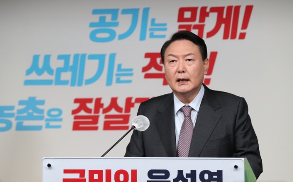▲ 국민의힘 윤석열 대선 후보가 25일 오전 서울 여의도 중앙당사에서 환경·농업·스포츠 공약을 발표하고 있다. [뉴시스]