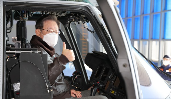 ▲ 더불어민주당 이재명 대선 후보가 28일 김포 해병대 항공대를 방문해 헬리콥터 탑승 후 포즈를 취하고 있다. [뉴시스]