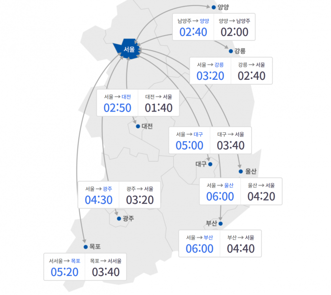 오후 12시 기준 승용차로 서울 요금소를 출발해 전국 주요 도시까지 걸리는 시간은 부산 6시간, 광주 4시간 30분, 울산 6시간, 대구 5시간, 대전 2시간 50분, 강릉 3시간 20분으로 추산된다.