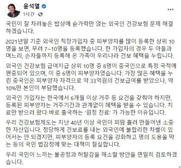 그러면서 "우리 건강보험제도는 지난 40년 이상 국민이 피땀 흘려 만들어낸 소중한 자산"이라며 "정당하게 건보료를 내는 외국인에 불합리한 차별이 있어서는 안 되겠지만 피부양자의 등록 요건을 강화하고 명의 도용을 막는 등의 국민 법감정에 맞는 대책이 절실하다"고 강조했다.