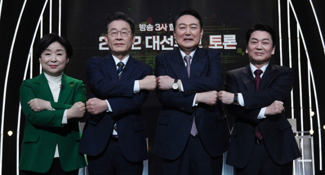 ▲ 3일 열린 '2022 대선 후보 토론'에 앞서 후보들이 기념촬영하고 있다. 왼쪽부터 심상정 정의당, 이재명 더불어민주당, 윤석열 국민의힘, 안철수 국민의당 대선 후보.[뉴시스]