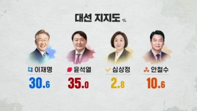 넥스트리서치와 SBS가 공동으로 지난 5, 6일 전국 만 18세 이상 1004명을 대상으로 여론조사를 실시해 7일 발표한 결과에 따르면 윤 후보는 35.0%, 이 후보는 30.6%를 기록했다.