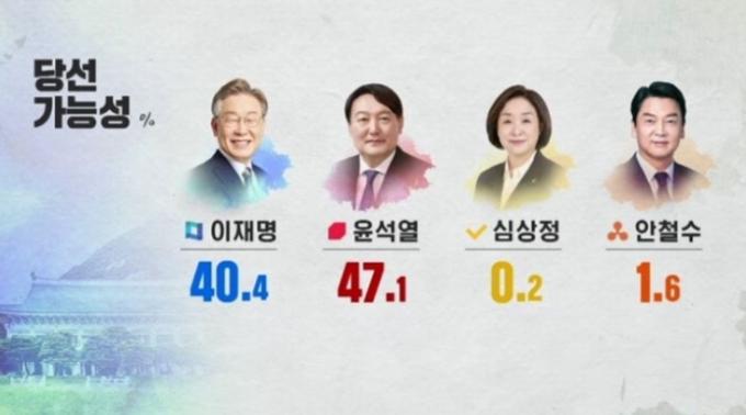 당선 가능성 조사에선 윤 후보가 47.1%를 얻었다. 이 후보는 40.4%였다. 격차가 6.7%p다. 윤 후보가 오차범위 밖에서 이 후보를 제친 것이다.
