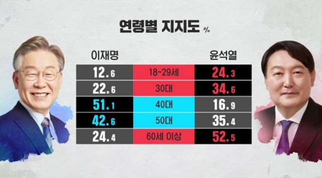 연령대별로 보면 이 후보는 40·50대에서, 윤 후보는 20·30대와 60세 이상에서 더 많은 지지를 받았다.