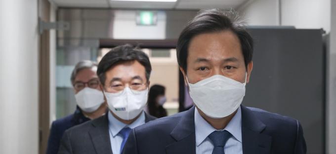 ▲ 더불어민주당 우상호 총괄선대본부장(오른쪽)이 지난 7일 서울 여의도 당사에서 열린 선거대책위원회 본부장단 회의장에 들어가고 있다. [뉴시스]