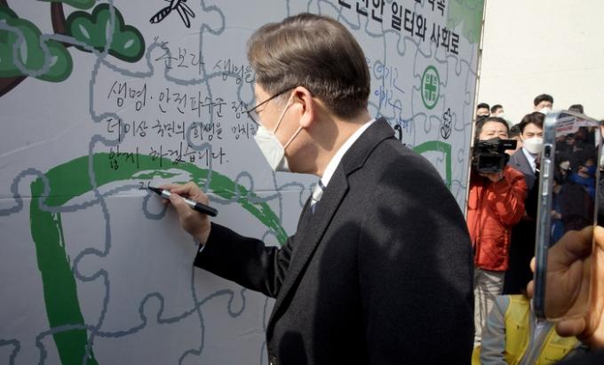 ▲ 더불어민주당 이재명 대선 후보가 9일 서울 중구 서울시의회 앞 '임시 기억공간' 마당에서 열린 생명안전 국민약속식에 참석해 조형물에 약속 문구를 적고 있다. [뉴시스]