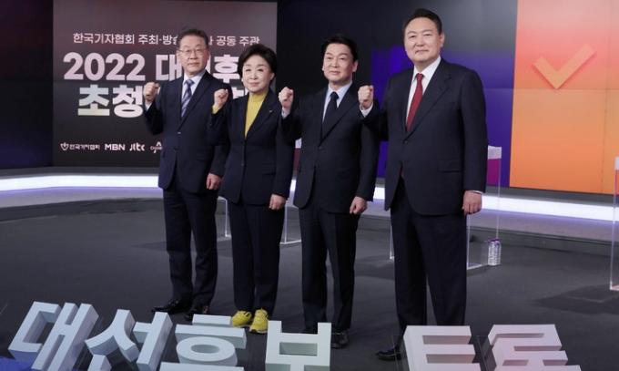 ▲더불어민주당 이재명(왼쪽부터), 정의당 심상정, 국민의당 안철수, 국민의힘 윤석열 대선 후보가 11일 오후 서울 중구 매경미디어센터에서 열린 한국기자협회 주최방송 6개사 공동 주관 2022 대선후보 초청 토론회 시작에 앞서 기념촬영을 하고 있다. [뉴시스]