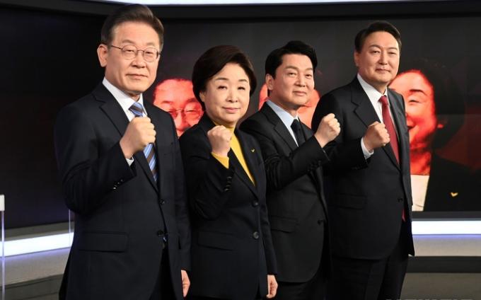 ▲ 더불어민주당 이재명(왼쪽부터), 정의당 심상정, 국민의당 안철수, 국민의힘 윤석열 대선 후보가 11일 오후 서울 중구 매경미디어센터에서 열린 한국기자협회 주최방송 6개사 공동 주관 2022 대선후보 초청 토론회 시작에 앞서 기념촬영을 하고 있다. [뉴시스]