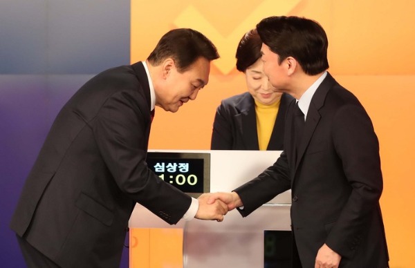 ▲ 국민의힘 윤석열(왼쪽), 국민의당 안철수 대선 후보가 지난 11일 서울 중구 매경미디어센터에서 열린 2차 4자 TV토론에 앞서 악수하고 있다. [뉴시스]