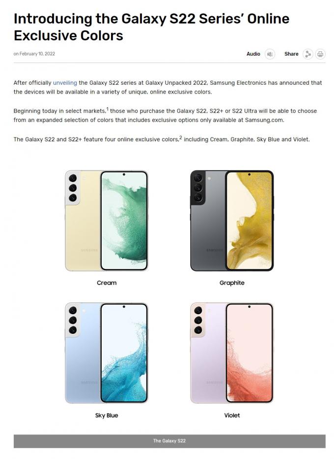삼성전자는 이동통신 온·오프라인 대리점과 유통점에서 팬텀 블랙, 팬텀 화이트, 그린, 핑크 골드를 판매하는 것과 별개로 삼성전자 온라인 페이지에서는 별도의 4개 색상을 한정판으로 판매 중이다. 갤럭시 S22+는 크림·그라파이트·스카이블루·바이올렛 4가지 색상이, 갤럭시S22 울트라는 그라파이트·레드·스카이블루 3가지가 한정판으로 공개됐다. 갤럭시S22 기본형은 빠졌다.