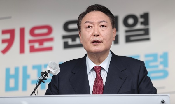 ▲ 국민의힘 윤석열 대선 후보가 14일 오전 서울 여의도 중앙당사에서 사법 분야 공약을 발표하고 있다. [윤석열 후보 선대본 제공]