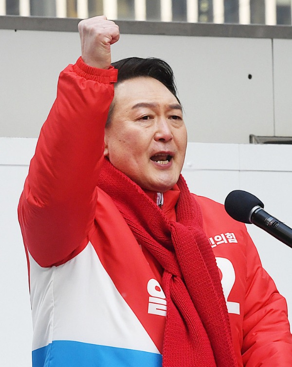 ▲ 국민의힘 윤석열 대선 후보가 20대 대선 공식 선거운동 개시일인 15일 오전 서울 종로구 청계광장에서 열린 '국민이 키운 윤석열' 출정식에서 연설하고 있다. [뉴시스]