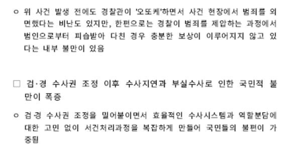 자료는 경찰개혁의 필요성 중 '경찰의 범죄 대처 능력에 대한 국민적 불신 증대' 항목에서 "2021년 11월 15일 인천 층간소음 문제로 이웃 주민에게 흉기를 휘두르는 범죄 현장에서 무장경찰관이 도망가고 결국 피해자가 흉기에 찔려 중태를 입은 사건이 발생(했다)"며 당시 상황을 설명했다. 이어 "위 사건 발생 전에도 경찰관이 '오또케'하며 사건 현장에서 범죄를 외면했다는 비난도 있지만 한편으로는 경찰이 범죄를 제압하는 과정에서 범인으로부터 피습받아 다친 경우 충분한 보상이 이루어지지 않고 있다는 내부 불만이 있다"고 전했다.