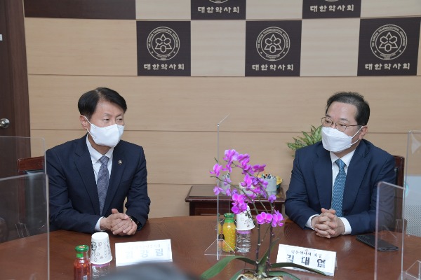 ▲ 김강립(왼쪽) 식품의약품안전처 처장이 16일 서울 서초구 대한약사회를 방문해 김대업 대한약사회 회장을 만나 코로나19 자가검사키트의 공급·가격 안정화와 국민의 원활한 구매 등을 위한 협조를 요청하고 있다. [식품의약품안전처 제공]