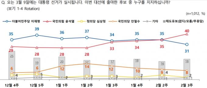 윤 후보는 4자 대결에서 40%를 기록했다. 이 후보는 31%였다. 지난주 조사에선 이, 윤 후보가 35%로 동률이었다. 일주일 새 초박빙 판세가 윤 후보의 오차범위(95% 신뢰수준에 ±3.1%p) 밖 우세로 바뀌었다.