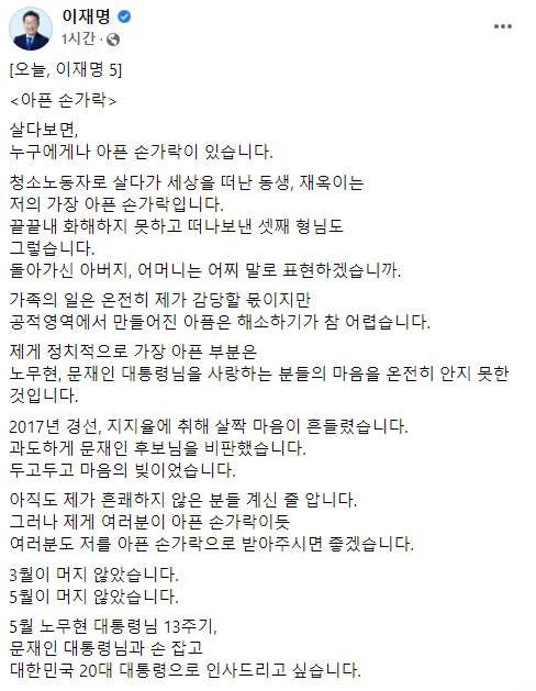이 후보는 이날 페이스북을 통해 "제게 정치적으로 가장 아픈 부분은 노무현, 문재인 대통령을 사랑하는 분들의 마음을 온전히 안지 못한 것"이라며 "공적 영역에서 만들어진 아픔은 해소하기가 참 어렵다"고 밝혔다.