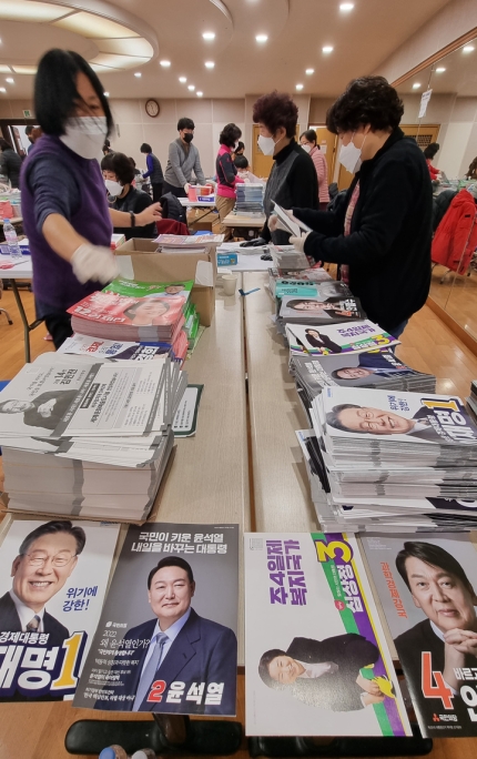 ▲ 중앙선관위 관계자들이 지난 22일 울산 남구 삼산동 주민센터에서 책자형 선거공보물 발송작업을 하고 있다. [뉴시스]