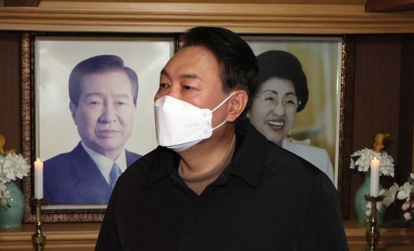 추모관에 들어선 윤 후보는 김 전 대통령과 이희호 여사 영정 앞에 헌화한 뒤 15초간 고개를 숙여 묵념했다.