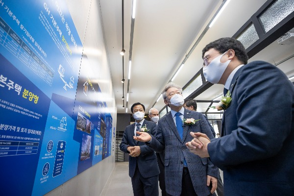 ▲ 지난해 2월 25일 GH 기본주택 홍보관 개관식에서 이재명(가운데) 당시 경기지사가 이헌욱(오른쪽) GH 사장과 대화하고 있다. [경기도 제공]