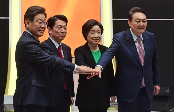 ▲ 여야 대선 후보가 지난 21일 서울 마포구 MBC에서 열린 중앙선관위 주관 첫 TV토론에 앞서 기념촬영을 하고 있다. 왼쪽부터 더불어민주당 이재명, 국민의당 안철수, 정의당 심상정, 국민의힘 윤석열 후보. [뉴시스]