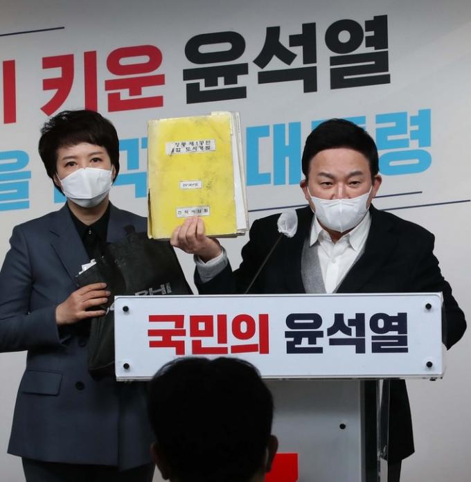 ▲ 국민의힘 원희룡 선대본 정책본부장이 25일 서울 여의도 당사에서 대장동 관련 긴급 기자회견을 열어 입수한 자료를 들어 보이고 있다. 왼쪽은 김은혜 공보단장. [뉴시스]