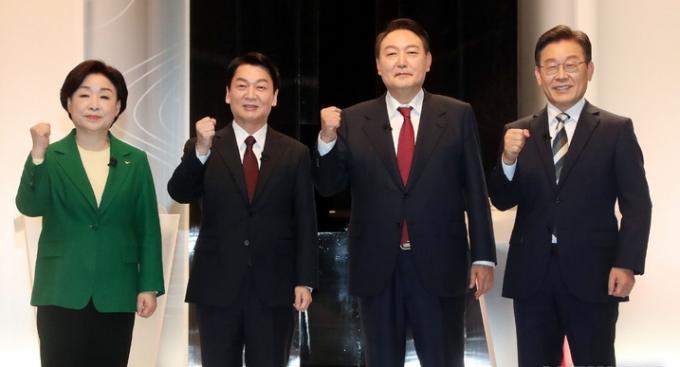 ▲ 여야 대선 후보가 25일 서울 마포구 SBS 프리즘타워 오디토리움에서 열린 중앙선관위 주관 2차 TV 토론에 앞서 기념촬영을 하고 있다. 왼쪽부터 정의당 심상정, 국민의당 안철수, 국민의힘 윤석열, 더불어민주당 이재명 후보. [뉴시스]