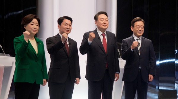 ▲ 정의당 심상정(왼쪽부터), 국민의당 안철수, 국민의힘 윤석열, 더불어민주당 이재명 대선 후보가 25일 서울 마포구 SBS 프리즘타워 오디토리움에서 열린 중앙선관위 주관 2차 TV 토론에 앞서 기념촬영하고 있다. [뉴시스]