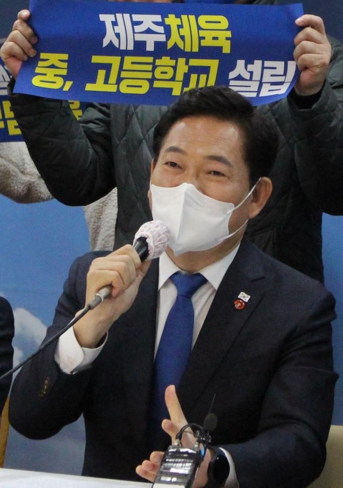 ▲더불어민주당 송영길 대표가 4일 오전 제주도의회 도민카페에서 열린 '제주체육희망포럼 이재명 후보 지지 선언 기자회견'에 참석해 이재명 후보 지지를 호소하고 있다. [뉴시스]