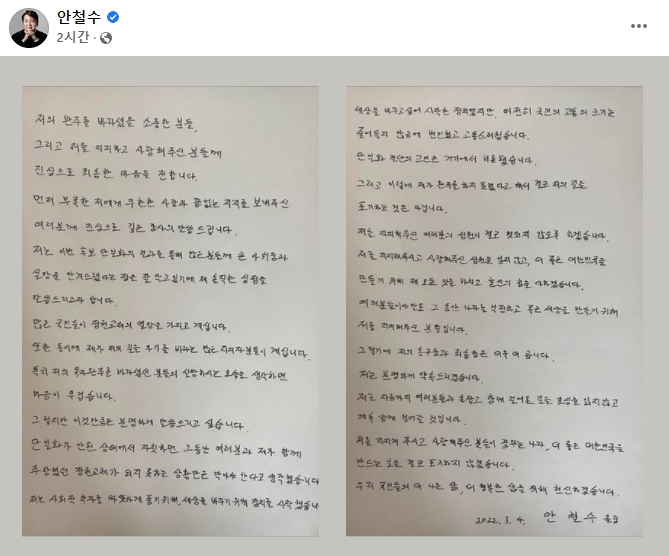 안 대표는 이날 오전 페이스북에 자필의 편지글 사진을 올려 "저의 완주를 바라셨을 소중한 분들, 그리고 저를 지지하고 사랑해주신 분들께 진심으로 죄송한 마음을 전합니다"라고 밝혔다. 분량은 A4용지 2장이다.