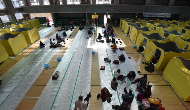 ▲ 경북 울진 산불 이틀째인 5일 오전 울진국민체육센터에 설치된 임시 대피소에 이재민들이 머물러 있다. [뉴시스]