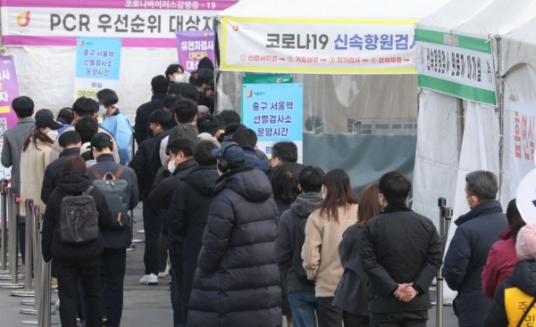 ▲ 4일 오전 서울 중구 서울역 임시선별검사소에서 시민들이 코로나19 검사를 받기 위해 줄 서 있다. [뉴시스]